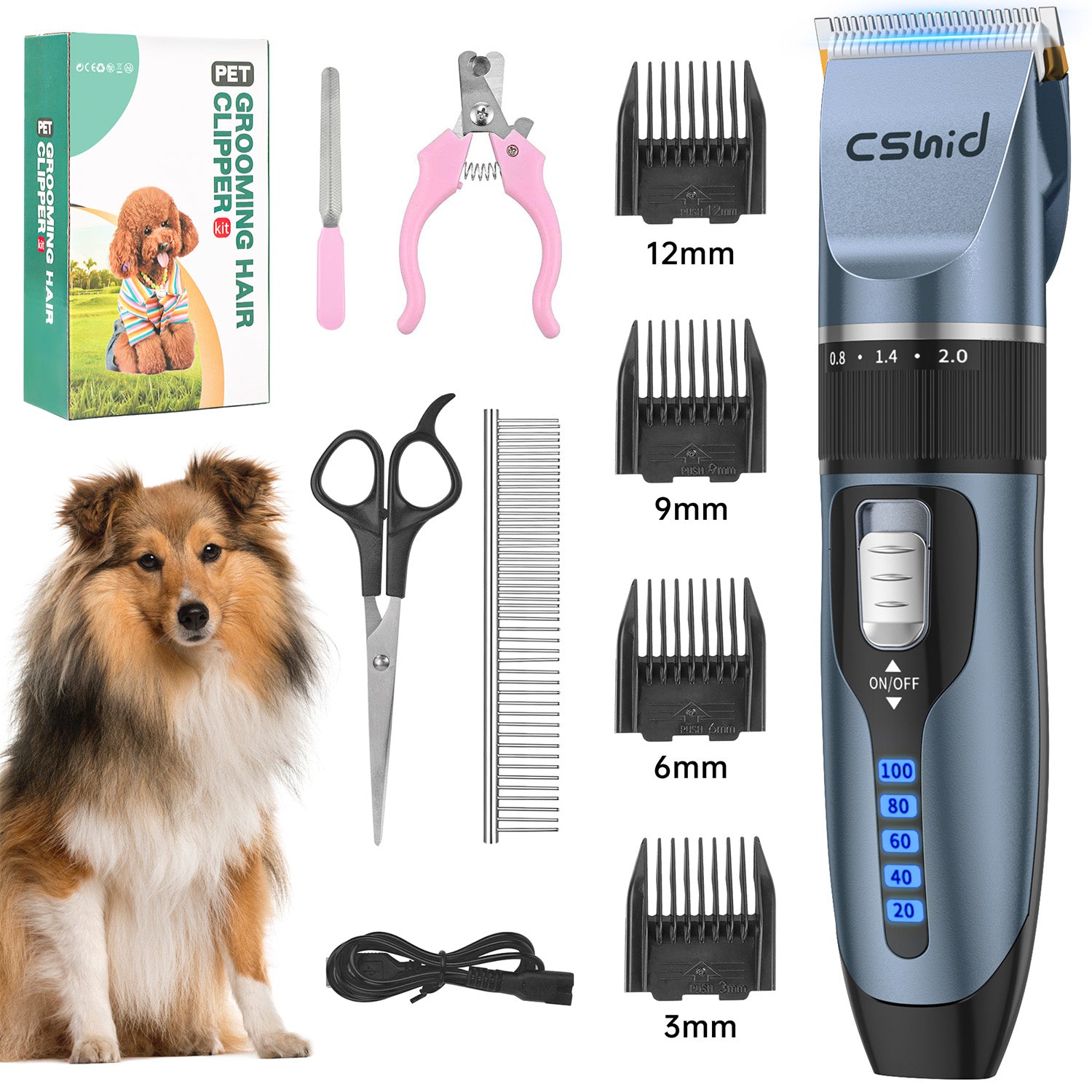 - [All in One box] Included a stainless steel scissor, a stainless steel comb, a nail clipper, a nail file, 4 guide guards(3mm,6mm,9mm,12mm).4 different size attachment combs work as guide comb to help you custom the cutting hair length, also work as guard combs make haircut safe and easy. You can give your dog cat a new look at home easily,and saving money from the pet shop.
